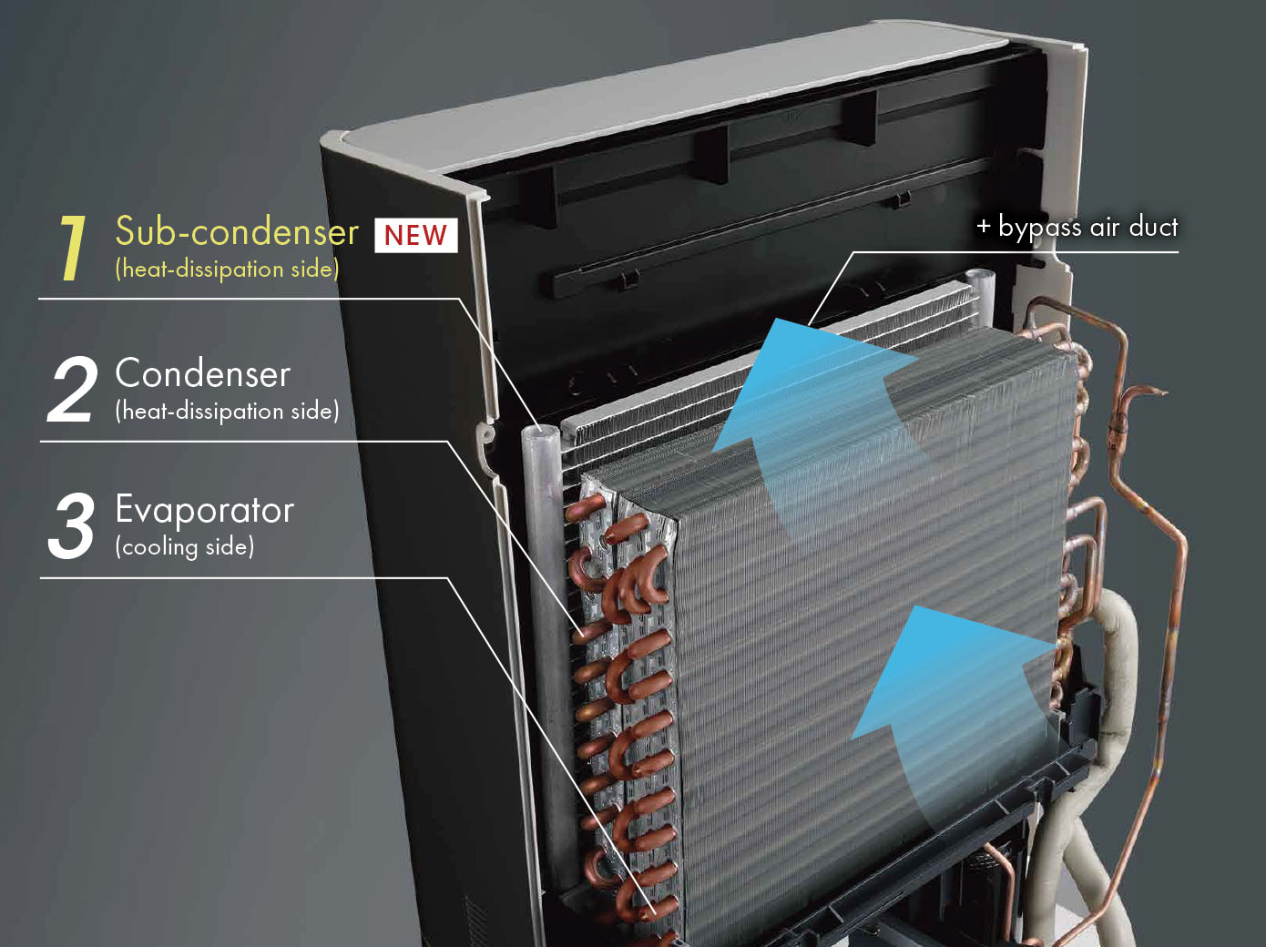 In order to maintain compact size, the sub-condenser has been reduced in thickness from approximately 25mm to 12mm. The new system maintains heat exchange surface area and efficiency while reducing air path resistance at the same time to achieve high energy-saving performance.