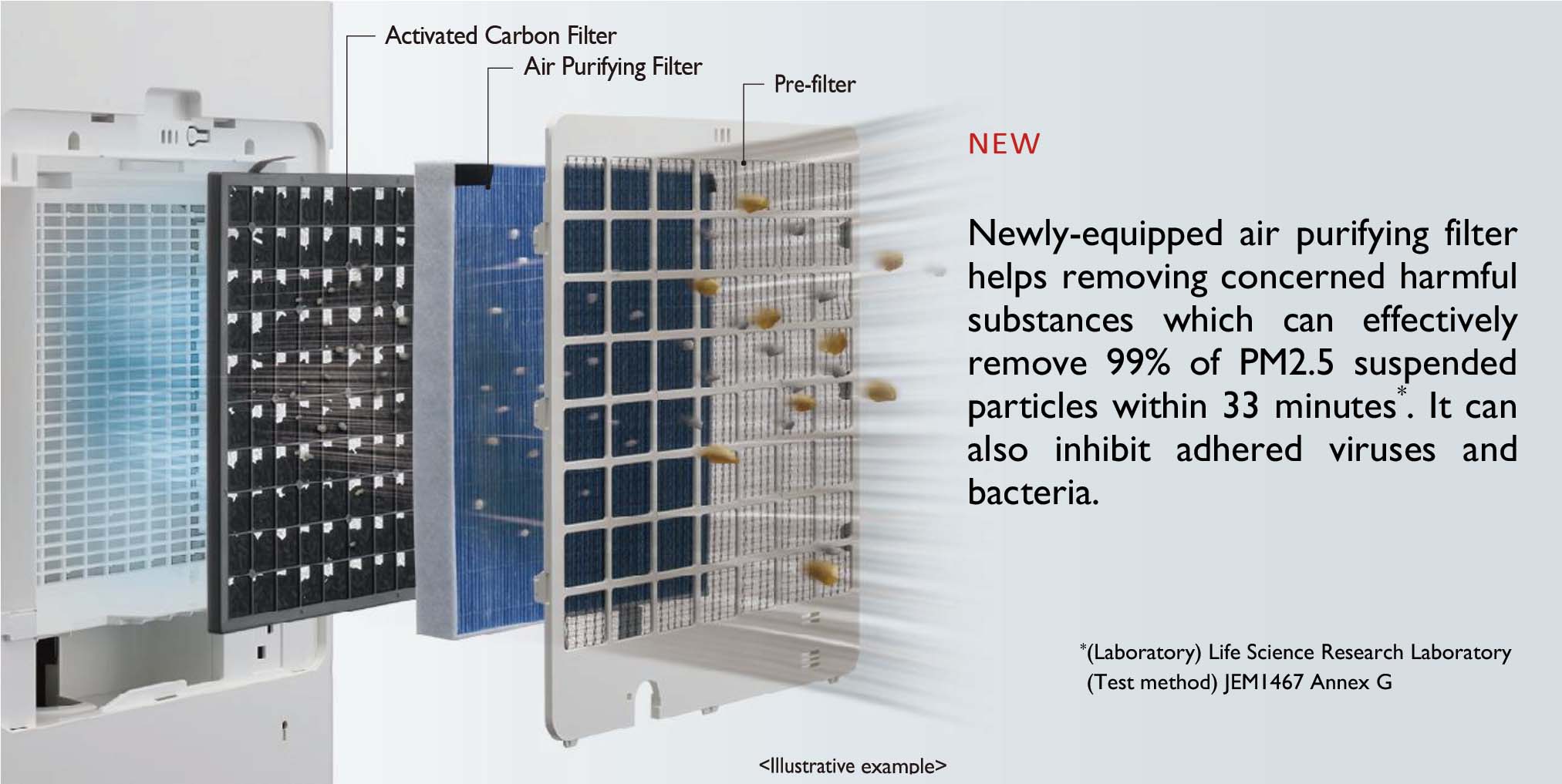 BIKUKAN Air Purifying Dehumidifier Dehumidifying capacity: - MEELS Standard: 23L/Day Water tank capacity: 5.5L Inverter technology Dehumidifying, air-purifying and deodorizing all in one Smart Auto mode with unique Smart Flaps Adjust indoor humidity and cleanliness automatically